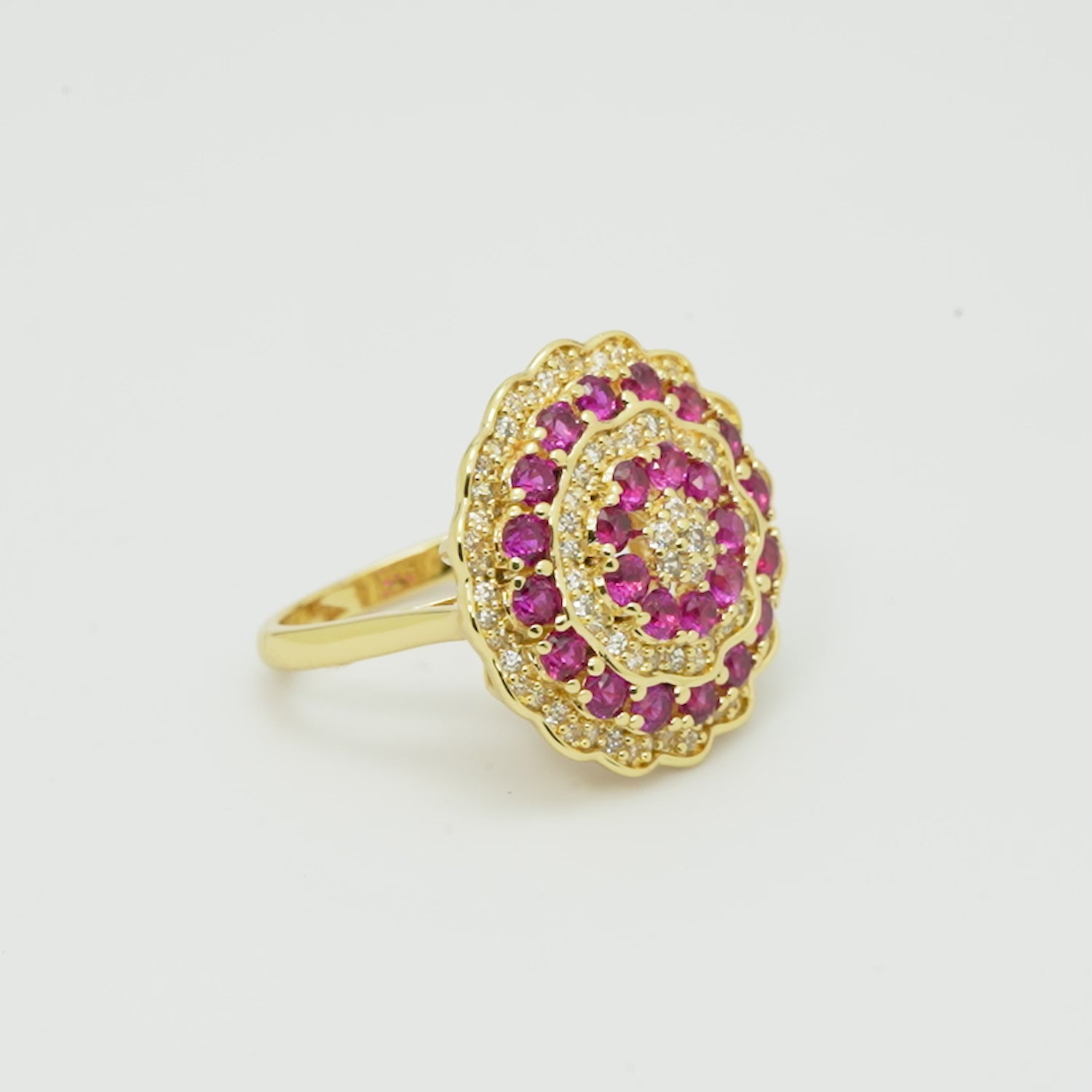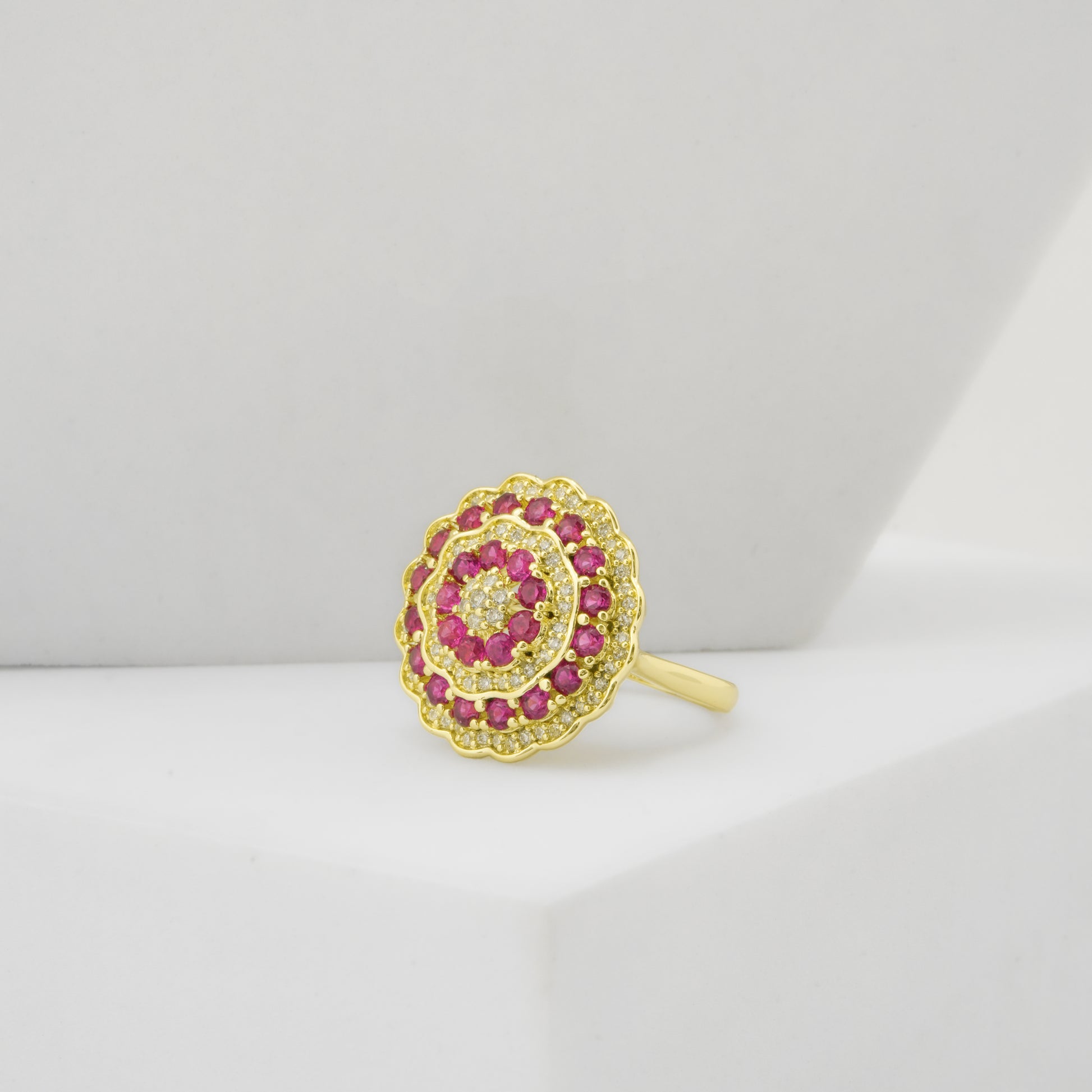 This circular design gold finish ring for women is a stunning piece of fashion jewelry crafted to bring sparkle and sophistication to your look. The ring features a layered circular design decorated with pink and white crystals, creating a radiant and festive charm. Its bold yet elegant design makes it a perfect statement ring for any occasion.