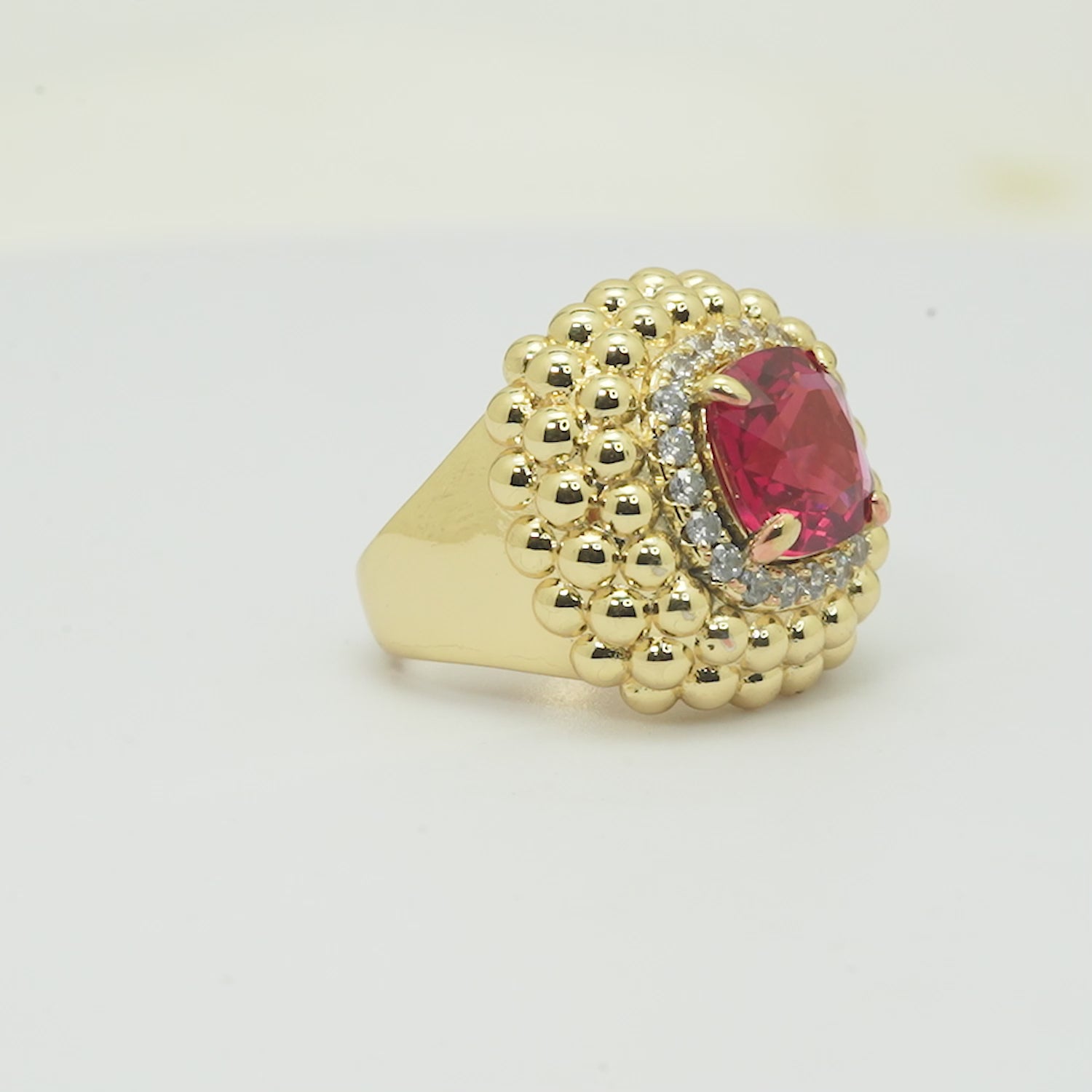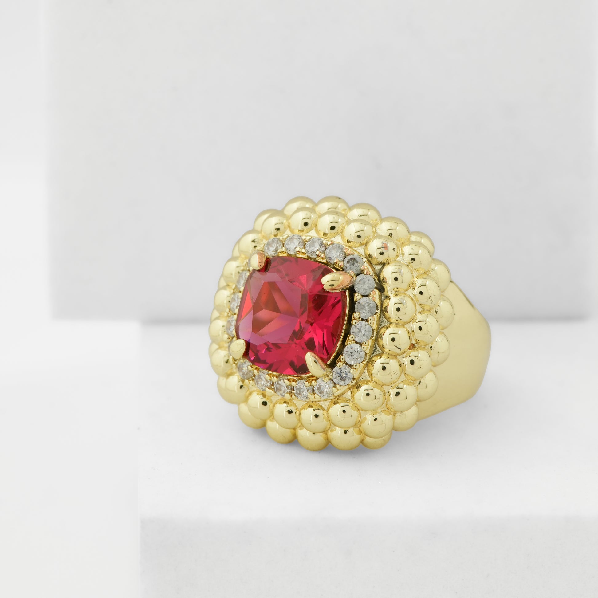 This red stone beaded border ring for women is a bold and elegant piece of fashion jewelry designed to stand out. The ring features a square-cut red stone at the center, surrounded by a unique beaded gold border pattern that gives it a rich and royal look. Its striking combination of bright red and glossy gold finish makes it a statement ring perfect for every occasion.