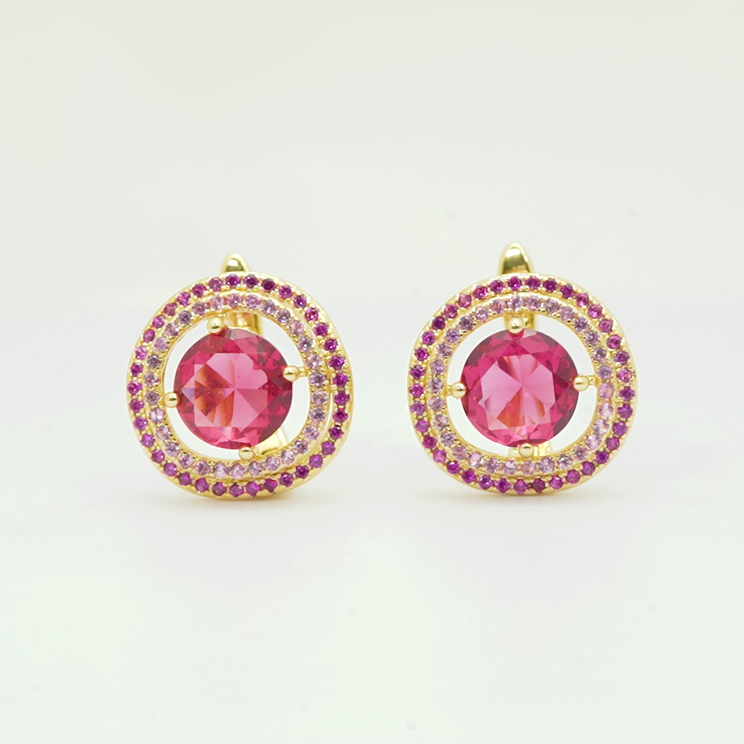 These radiant gold-plated circular stud earrings bring together the timeless beauty of classic design with a bold, contemporary edge. At the heart of each earring lies a luminous central pink gemstone, exuding vibrance and sophistication. Surrounding it are two concentric halos of ruby red stone accents, adding depth, brilliance, and a luxurious finish. The circular silhouette symbolizes harmony and unity, making these earrings not just an accessory, but a statement of refined elegance.