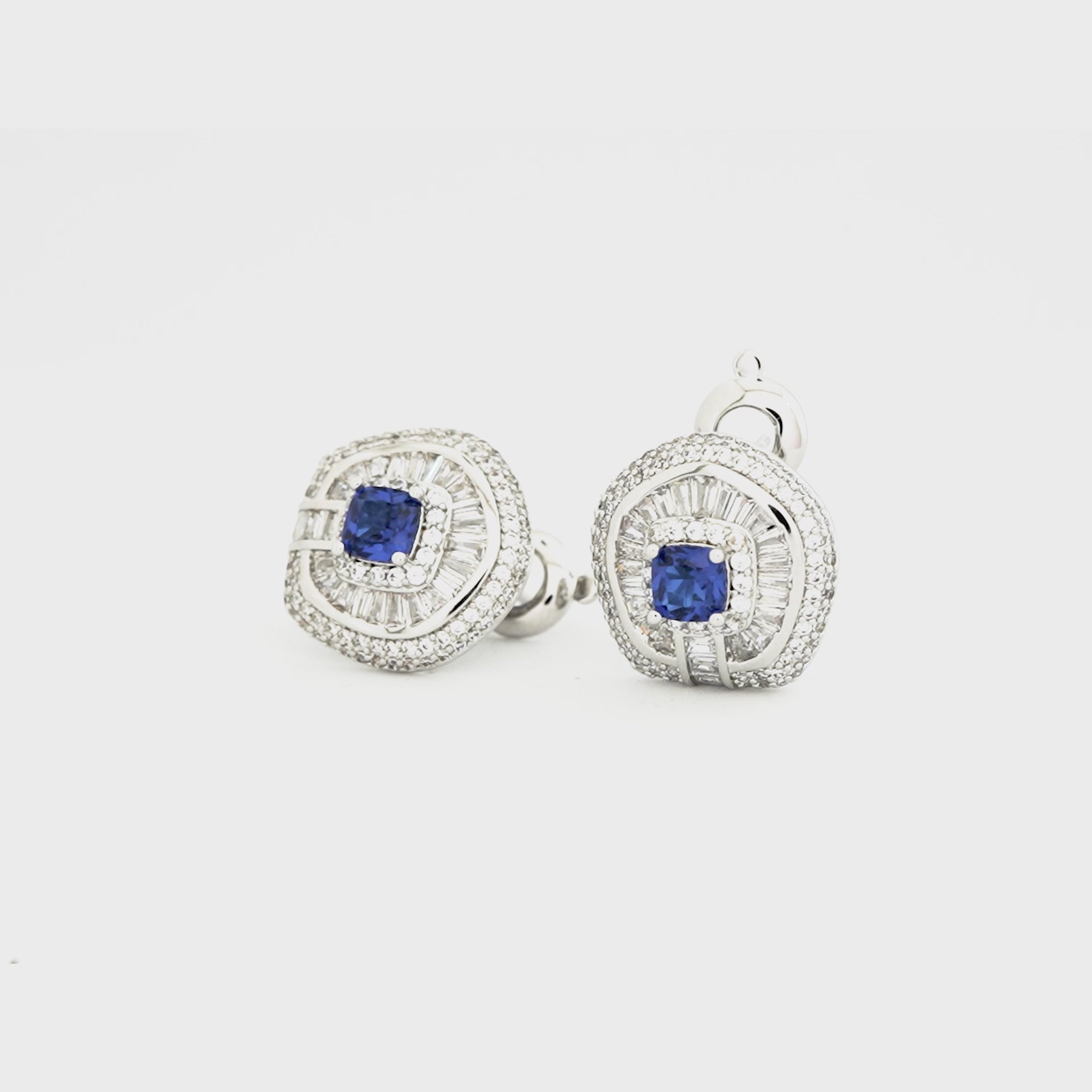 Exquisite Silver-Toned Blue Sapphire Earrings with Diamond Halo and Baguette Detailing | Luxury Statement Jewelry for Weddings, Parties, and Special Celebrations
