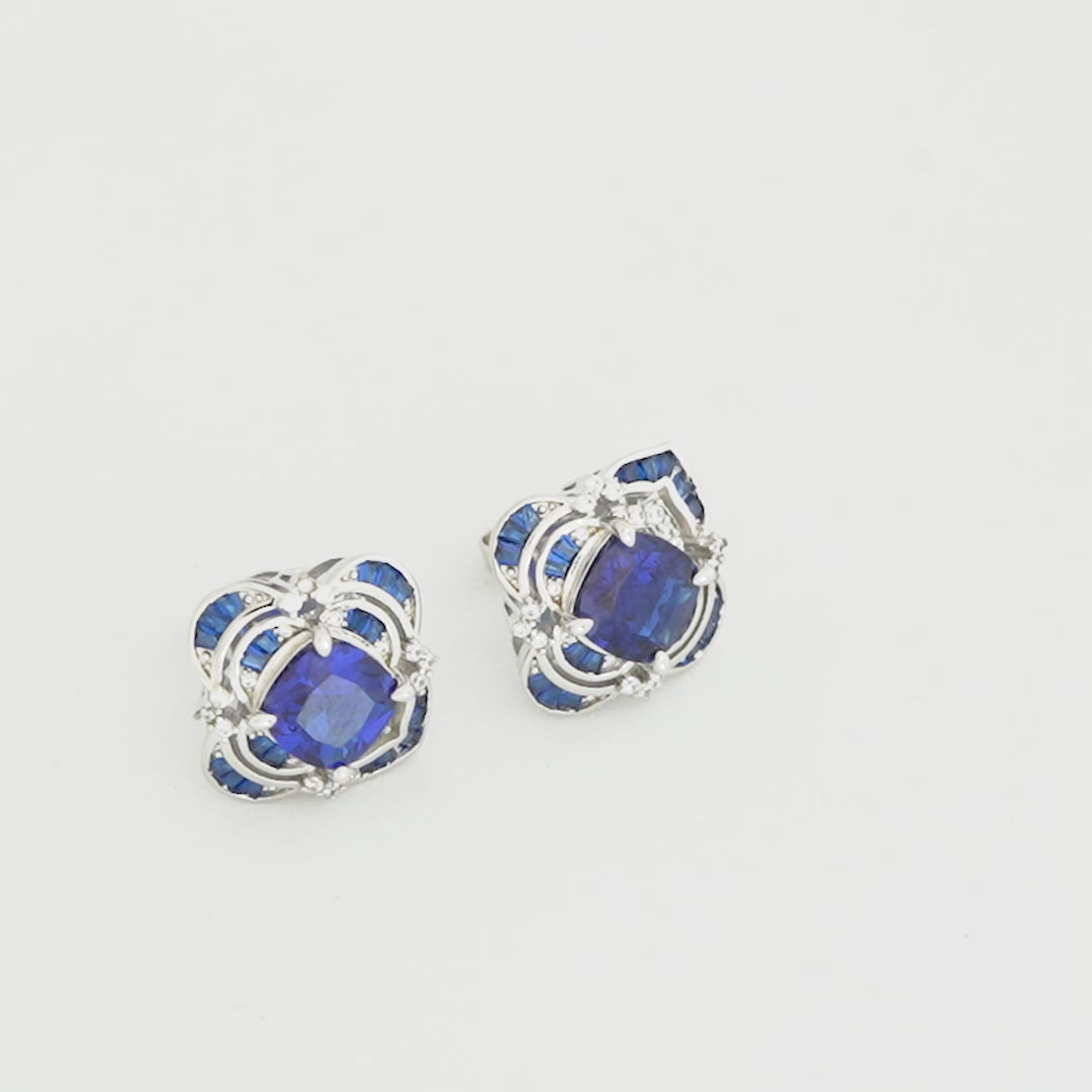 Step into elegance with these Royal Blue Sapphire Stud Earrings, designed to radiate sophistication. Featuring a brilliant cushion-cut sapphire blue centerpiece, surrounded by a halo of diamond-like accents and baguette-cut blue stones, these earrings embody timeless luxury.
