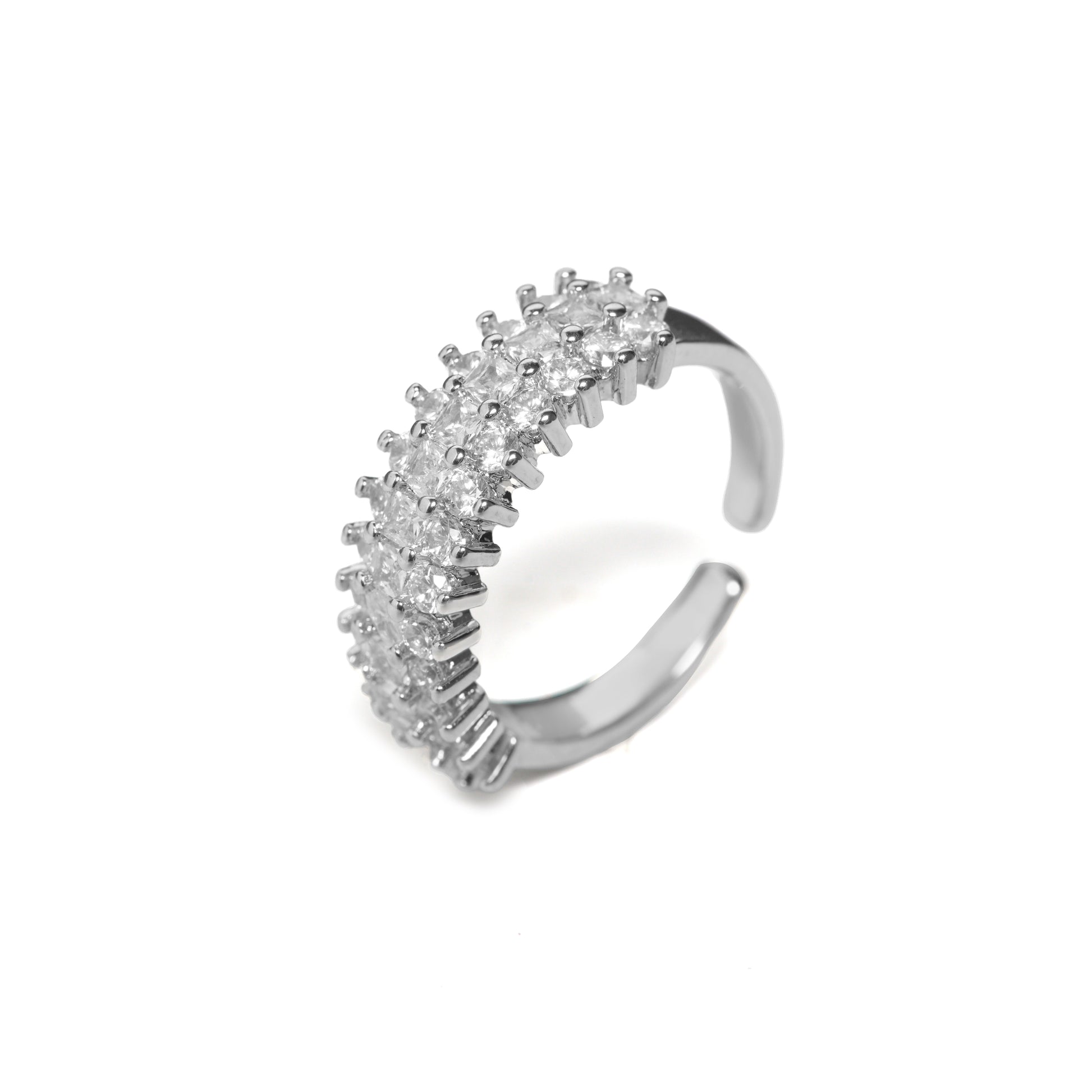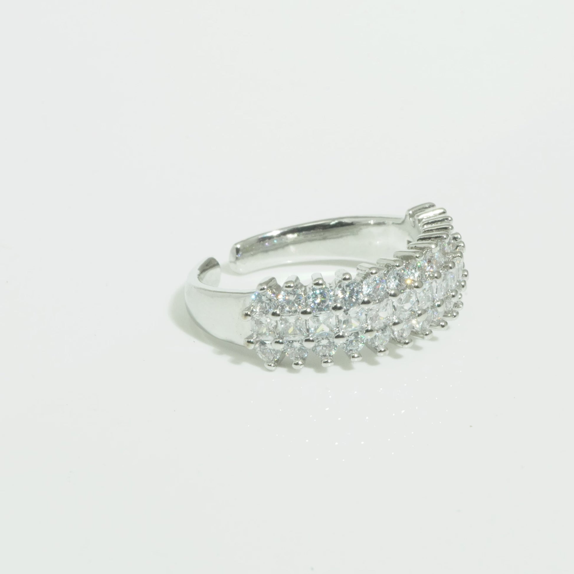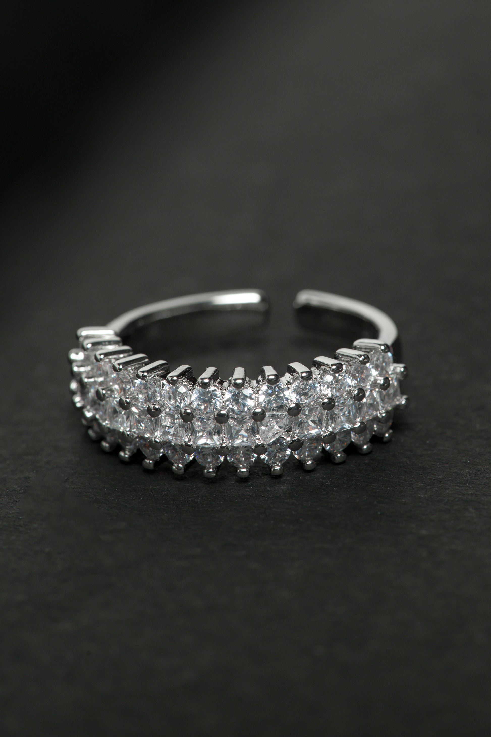 The geometric precision of the baguette stones gives the ring a sleek, modern aesthetic, while the wide-band silhouette adds a bold, glamorous presence on the finger. With its adjustable open-back design, the ring offers a comfortable and customizable fit suitable for any finger.