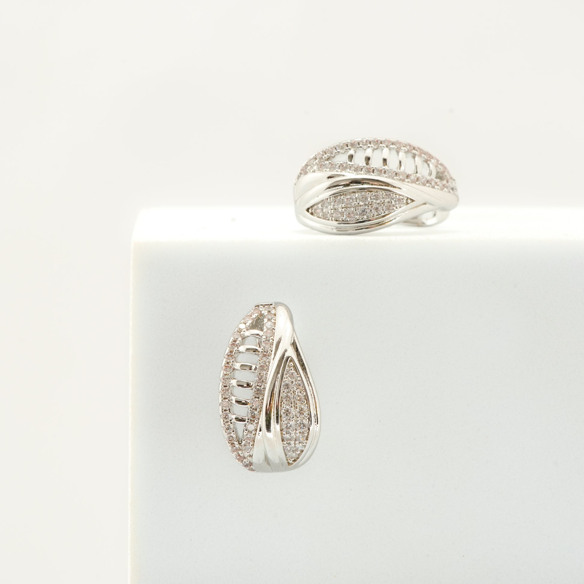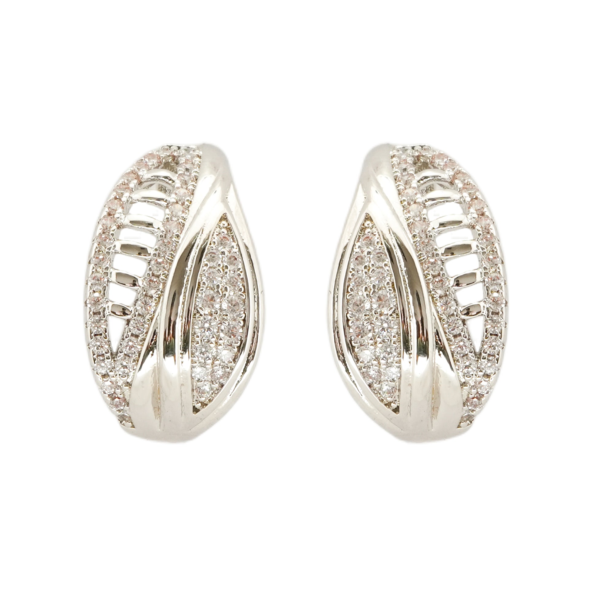 Exuding sophistication with a modern flair, these silver-plated hoop-style earrings are a true statement of timeless luxury. Featuring an elongated oval silhouette, the design is enriched with delicate cut-out detailing and encrusted with sparkling diamond-like pave accents that shimmer with every movement. The structured yet fluid form gives these earrings a versatile charm, making them suitable for both casual elegance and evening glamour.