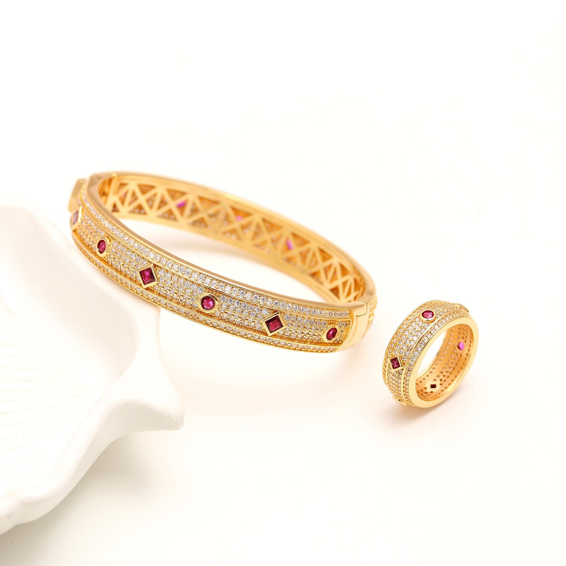 The bracelet’s refined structure perfectly complements the matching ring, making it a versatile pair for weddings, festive events, cocktail nights, and cultural celebrations. With its radiant gold tone, shimmering pavé, and bold ruby accents, this set is a must-have for women who love statement jewelry with a classic charm.