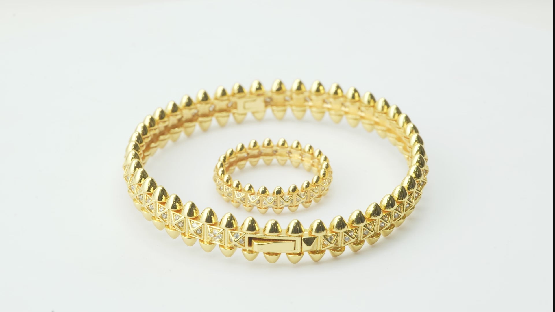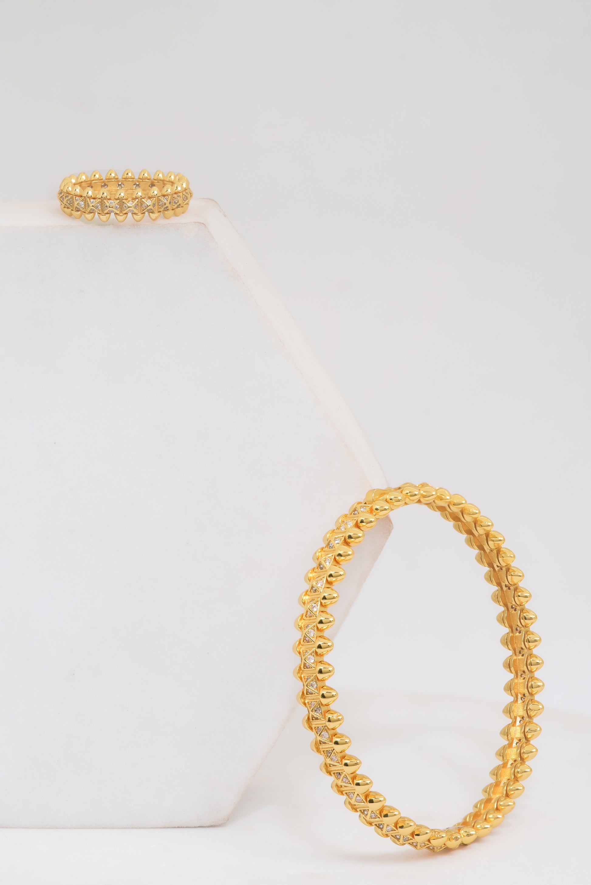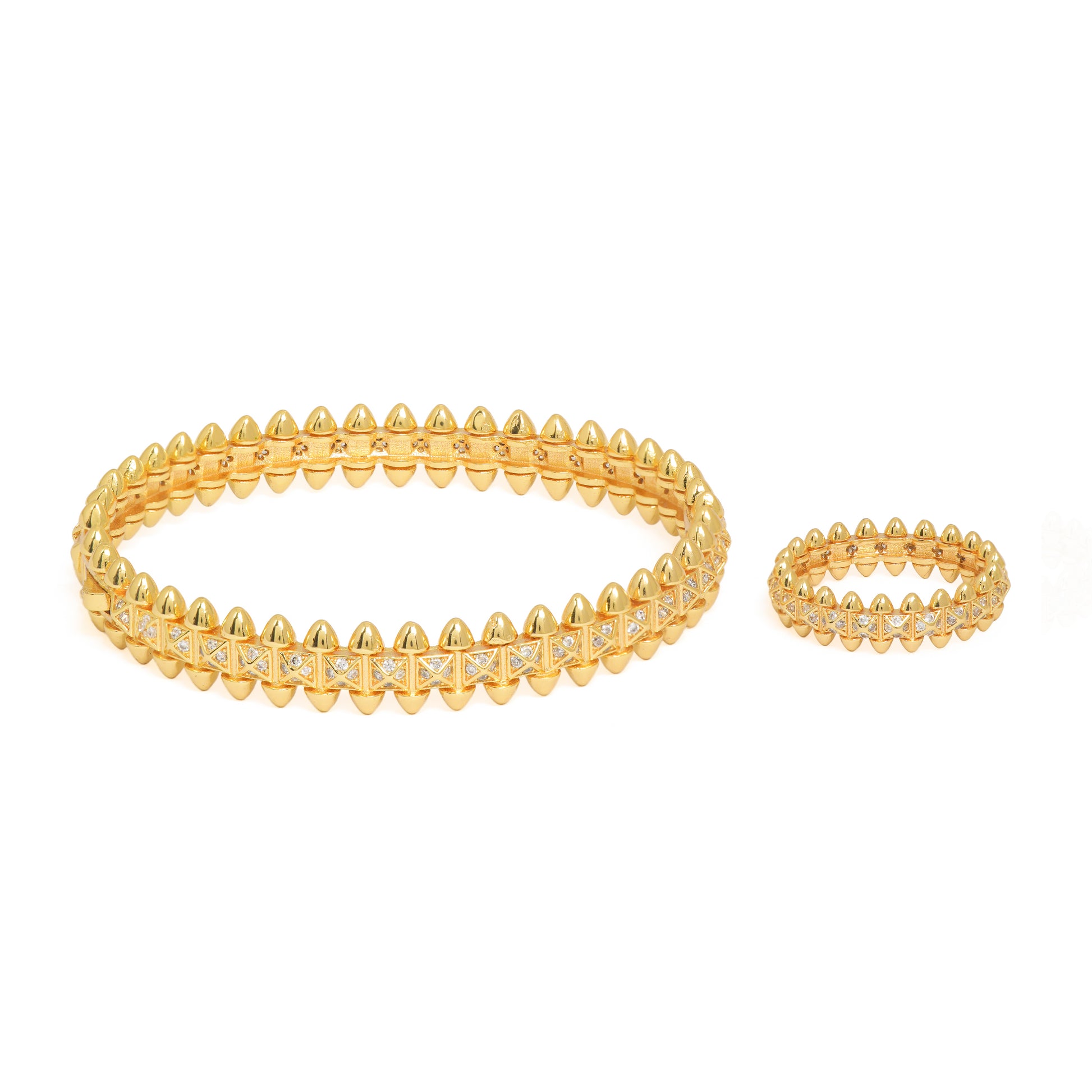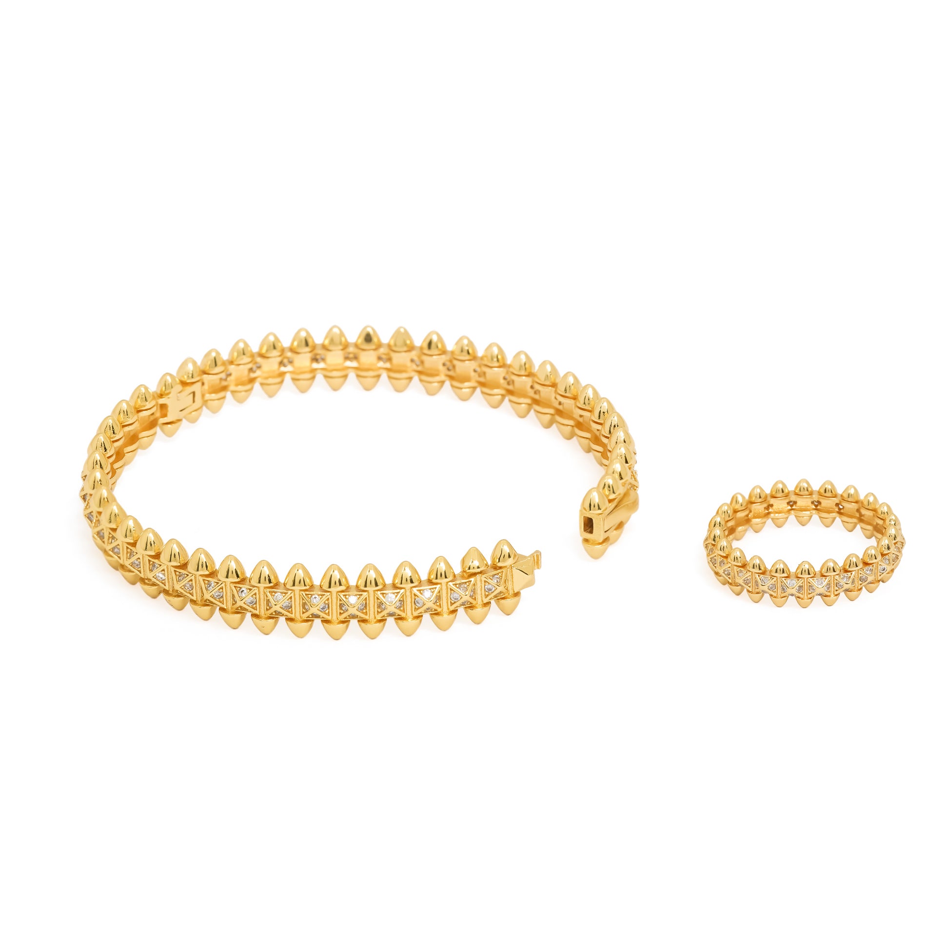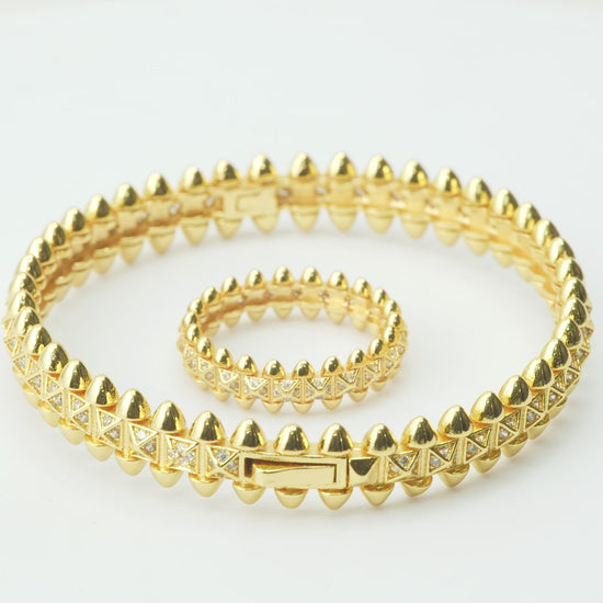 A bold and modern gold-tone bracelet and ring featuring an assertive design of pointed spikes alternating with delicate, pave-set cubic zirconia triangles, perfect for a statement look.