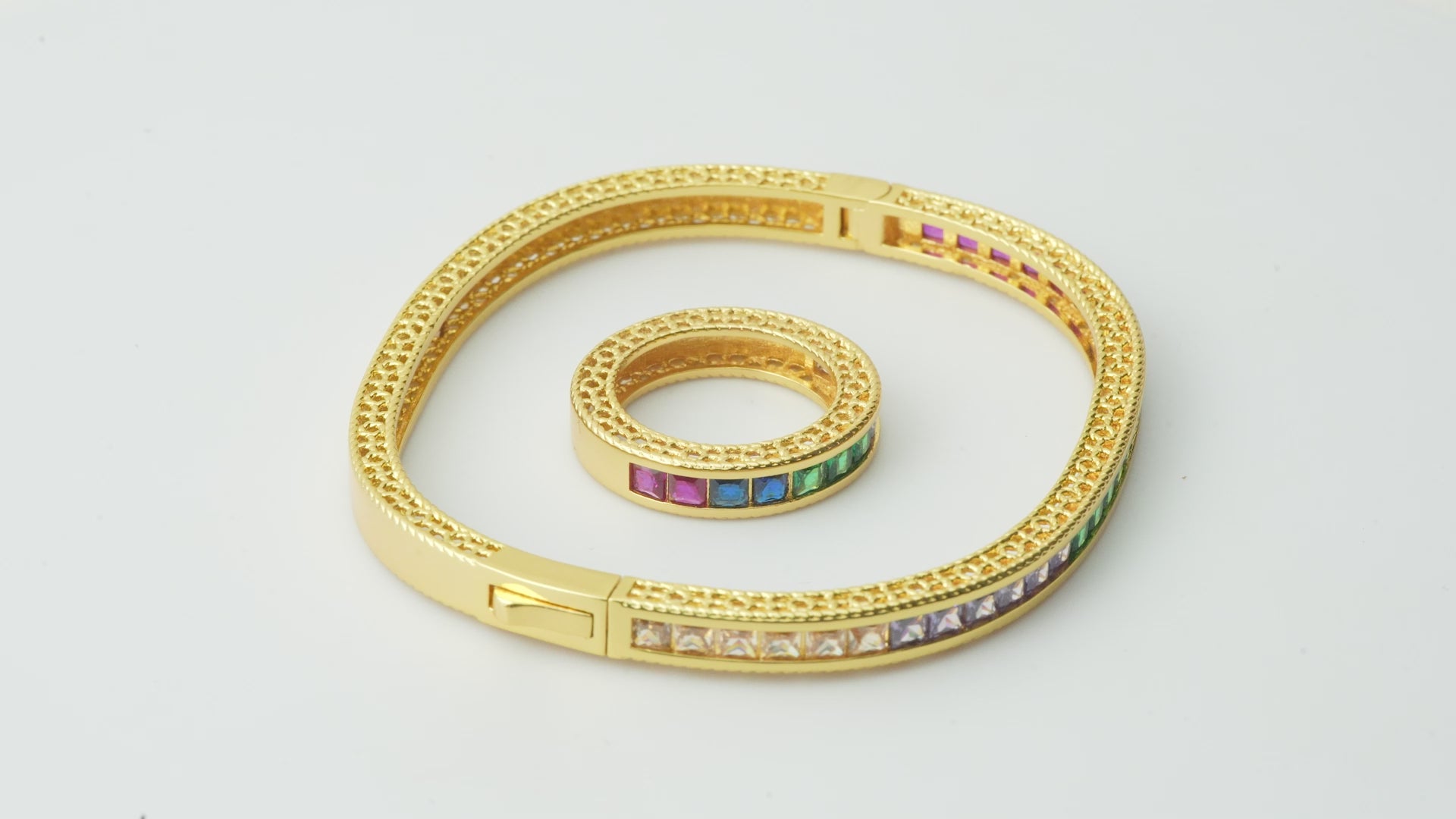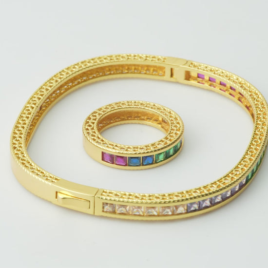 A sleek, square-profile gold-tone bangle and ring featuring a striking single channel of large, rectangular cubic zirconia stones in an eye-catching gradient of multi-colors.