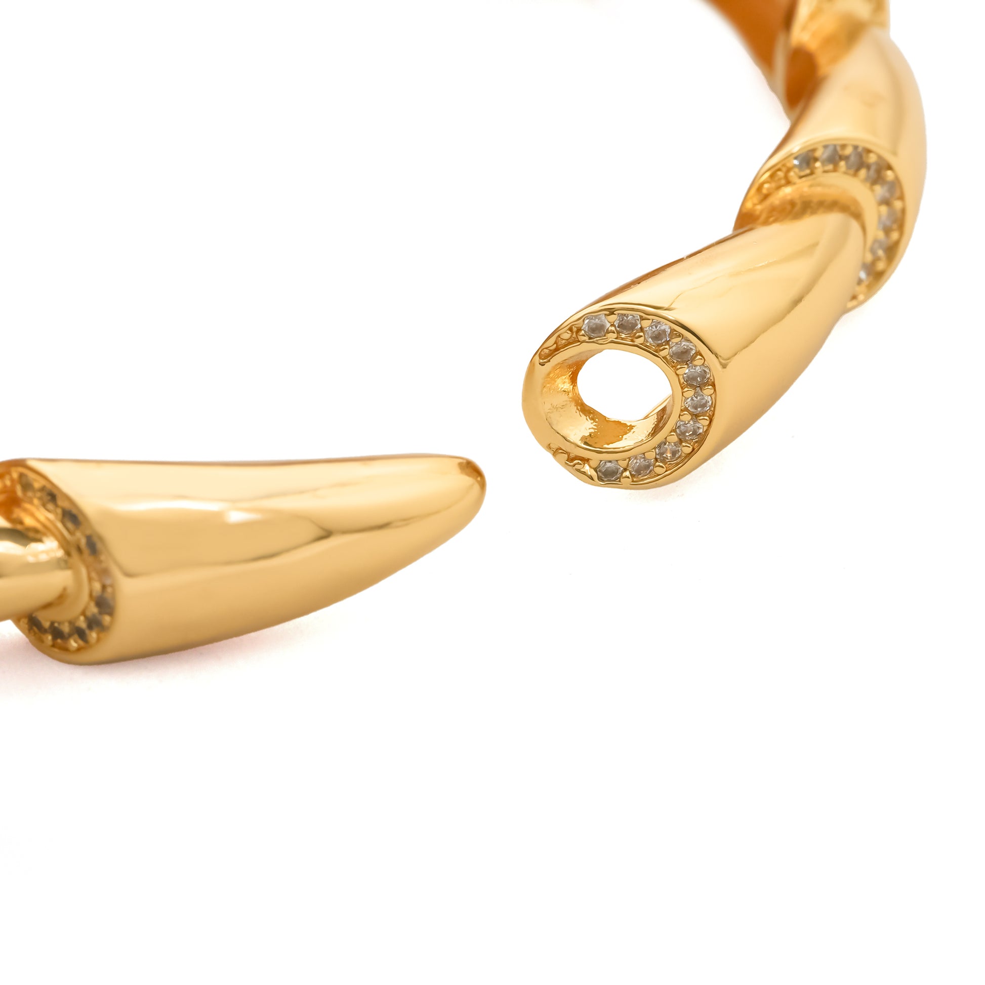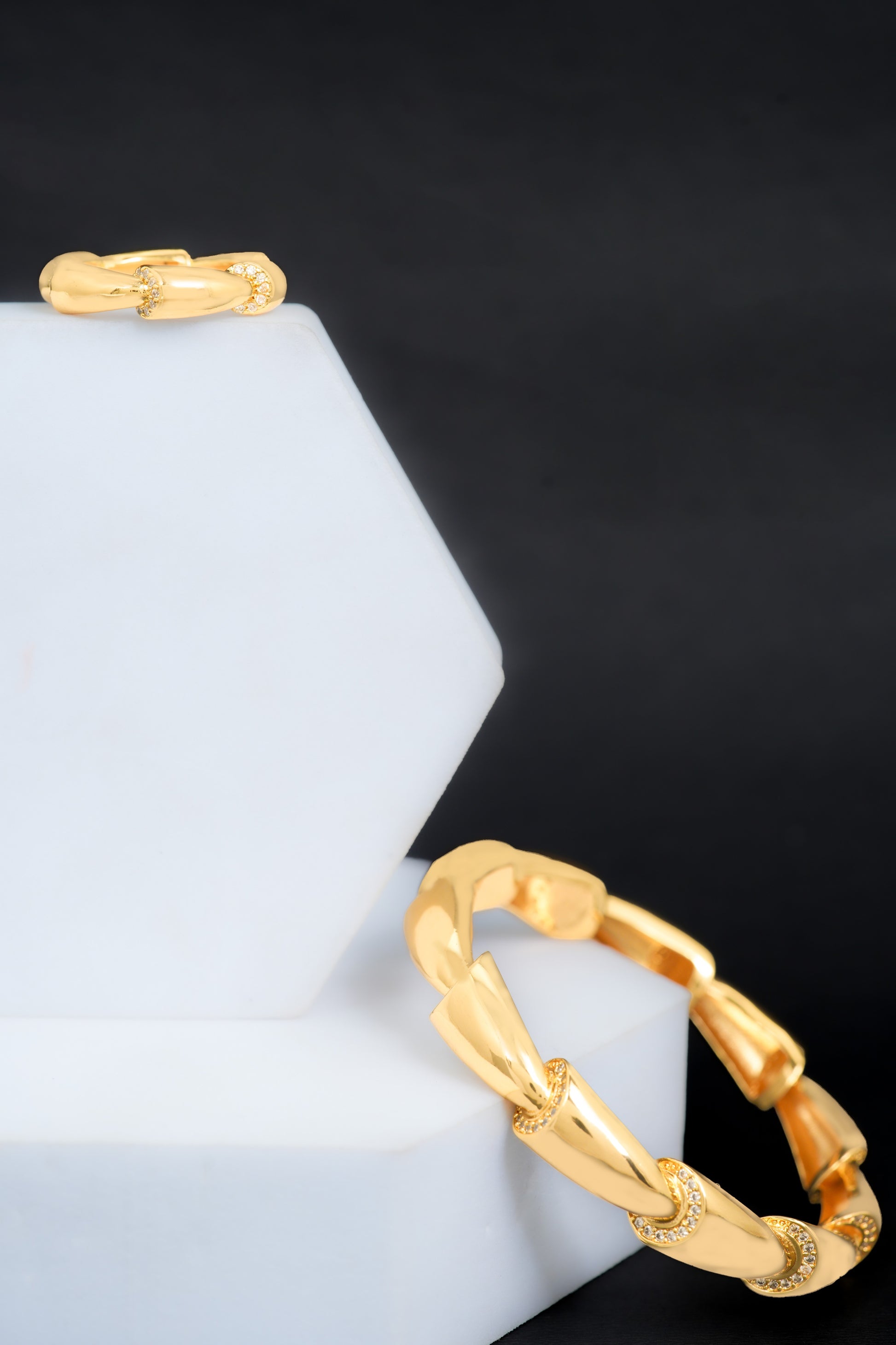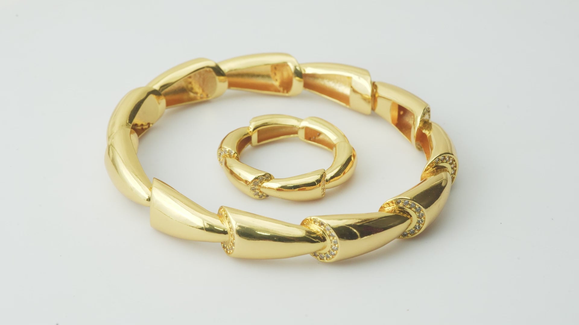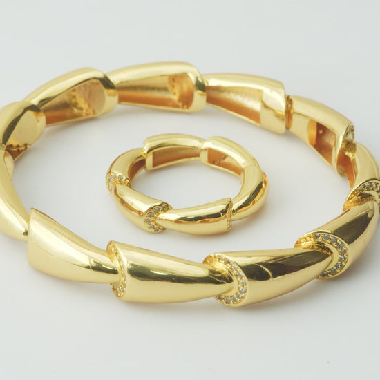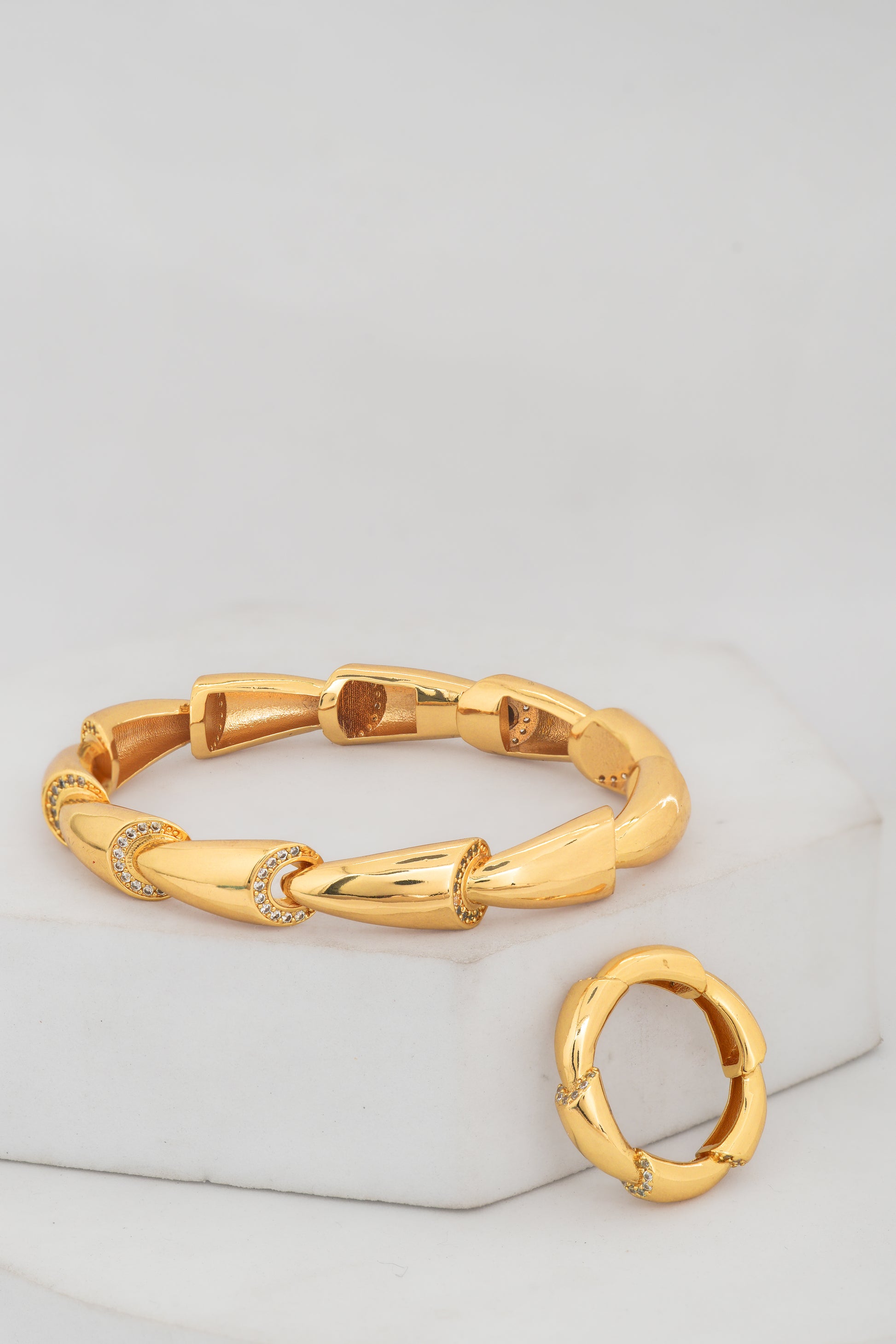 A fluid, articulated gold-tone bracelet and matching ring with a stylized, tapering link design and subtle pave cubic zirconia accents, mimicking the sleek movement of a snake or a continuous coil.