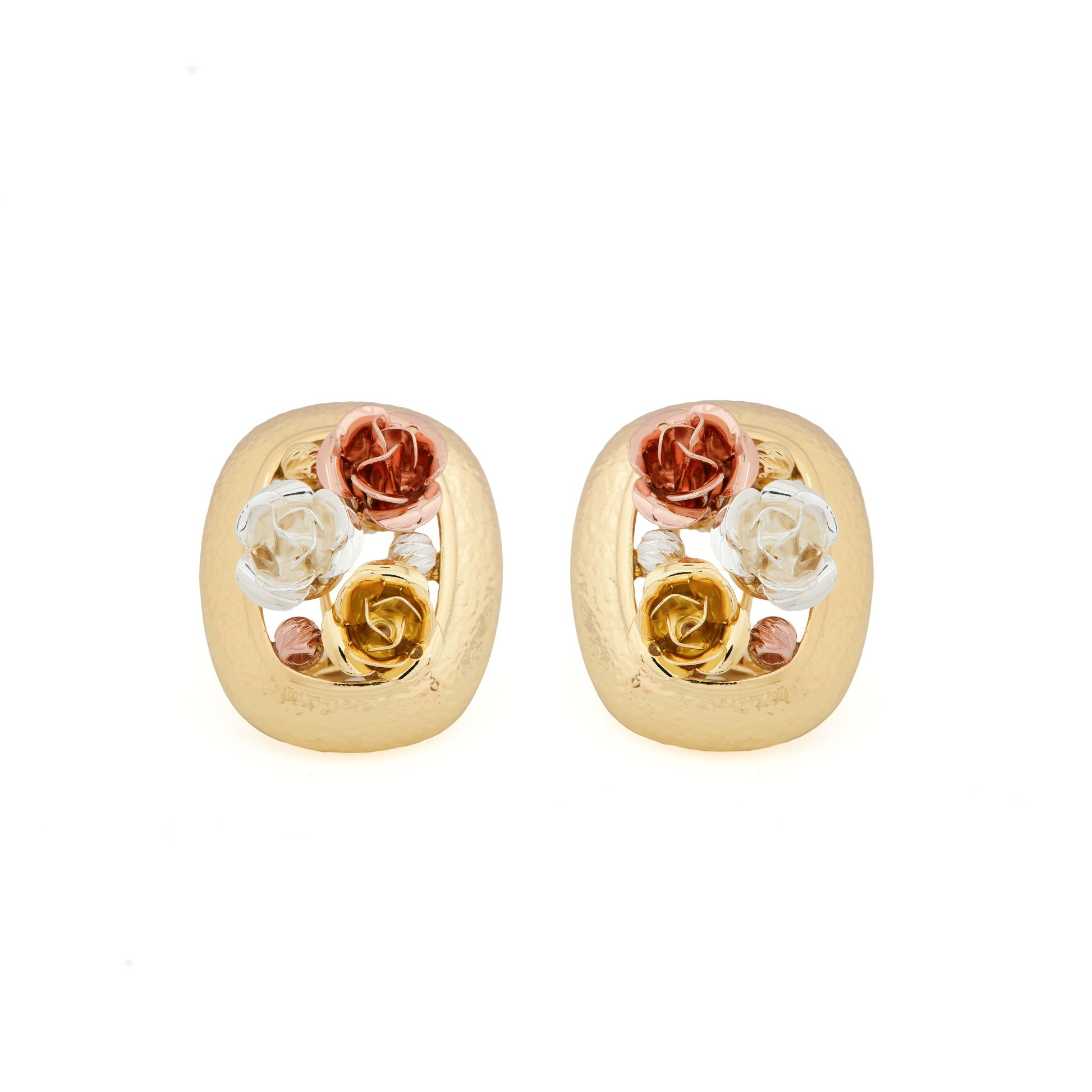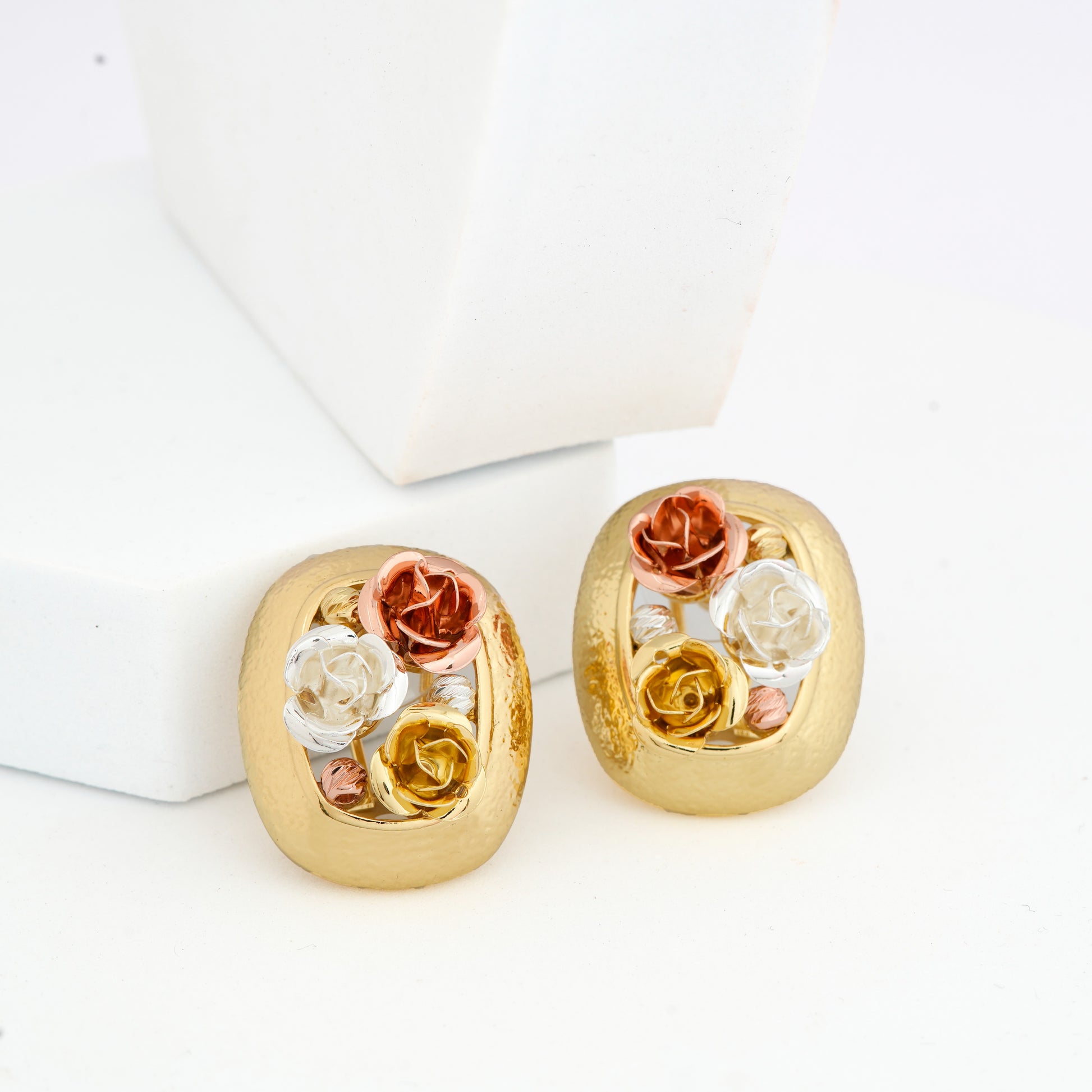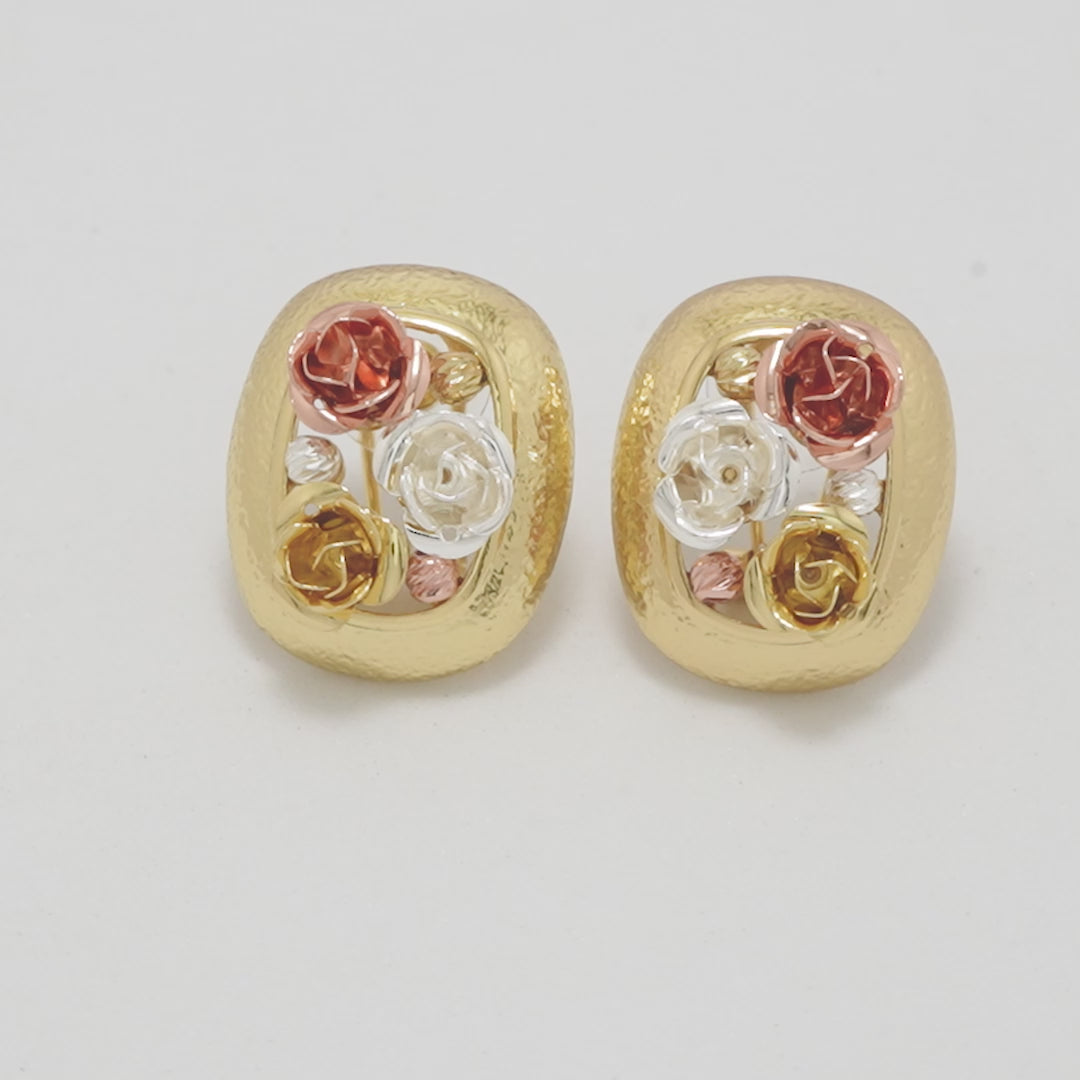 Elegant Gold-Plated Stud Earrings with Intricate Three-Tone Rose Motif in White, Yellow, and Rose Gold Finish for Timeless Floral Charm