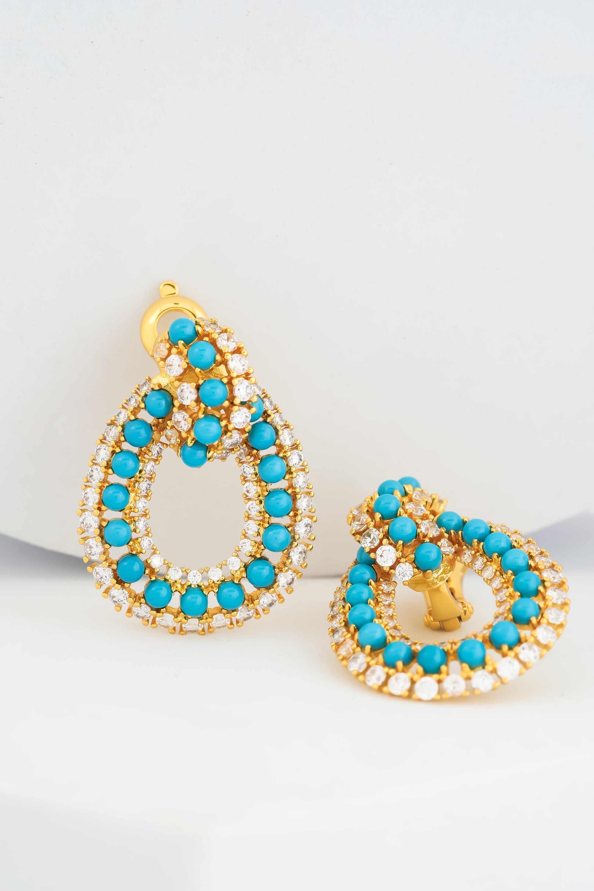Add a vibrant touch of sophistication to your collection with these Turquoise and Diamond-Accented Gold Teardrop Earrings. Designed with a double-layered teardrop silhouette, these earrings showcase radiant turquoise cabochons perfectly set against a backdrop of sparkling white diamond-like stones, all crafted in a polished gold finish.
