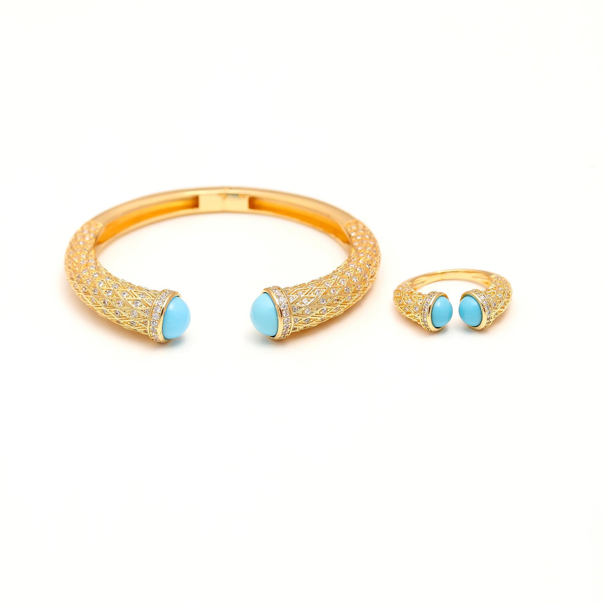 Bring a fresh pop of color to your jewelry collection with this exquisite bangle and ring set. Designed in a radiant gold-tone finish, the set features striking turquoise cabochon tips, highlighted with sparkling diamond-look pavé that adds brilliance and depth. The openable bangle ensures comfort and versatility, while the perfectly coordinated ring completes the look with a touch of modern sophistication.