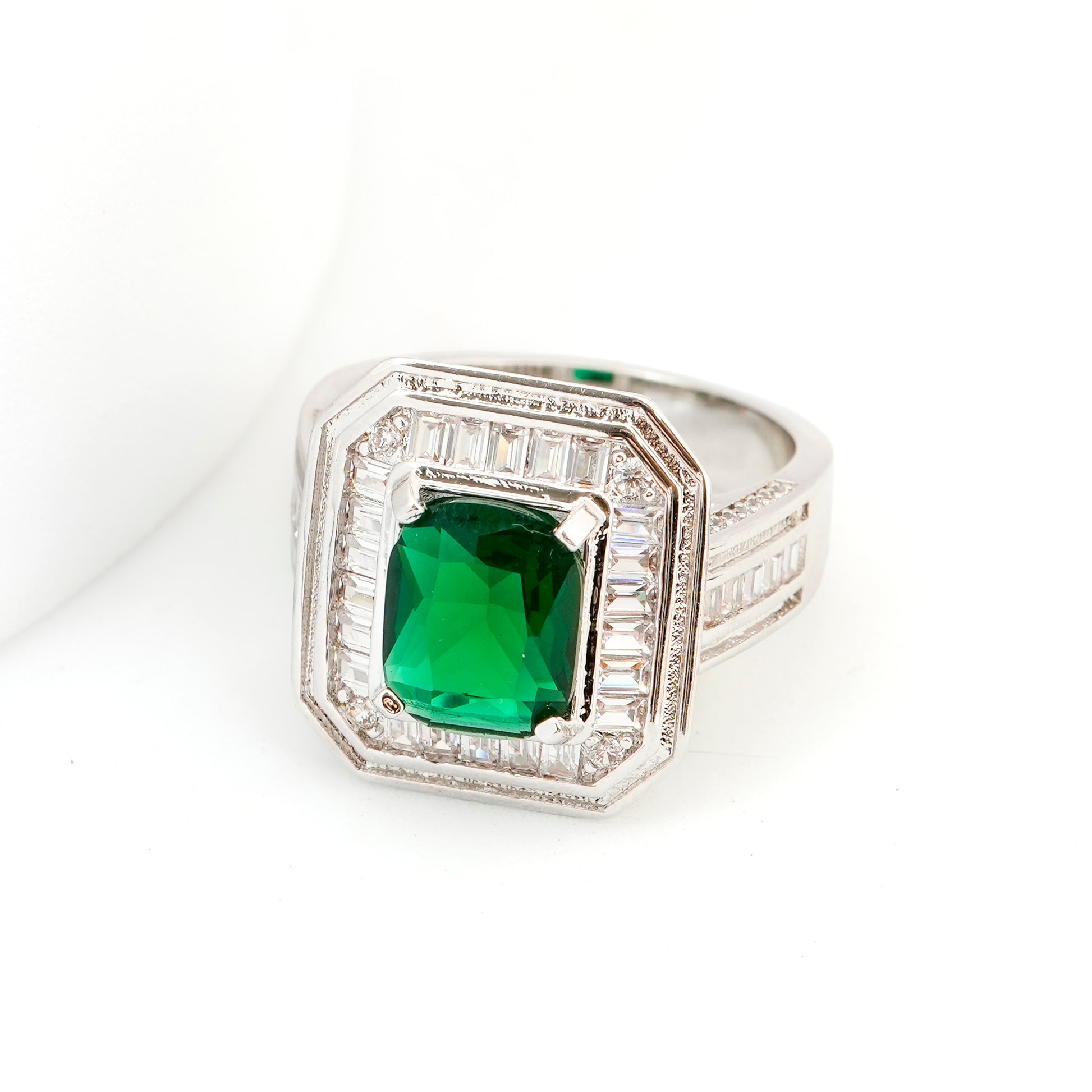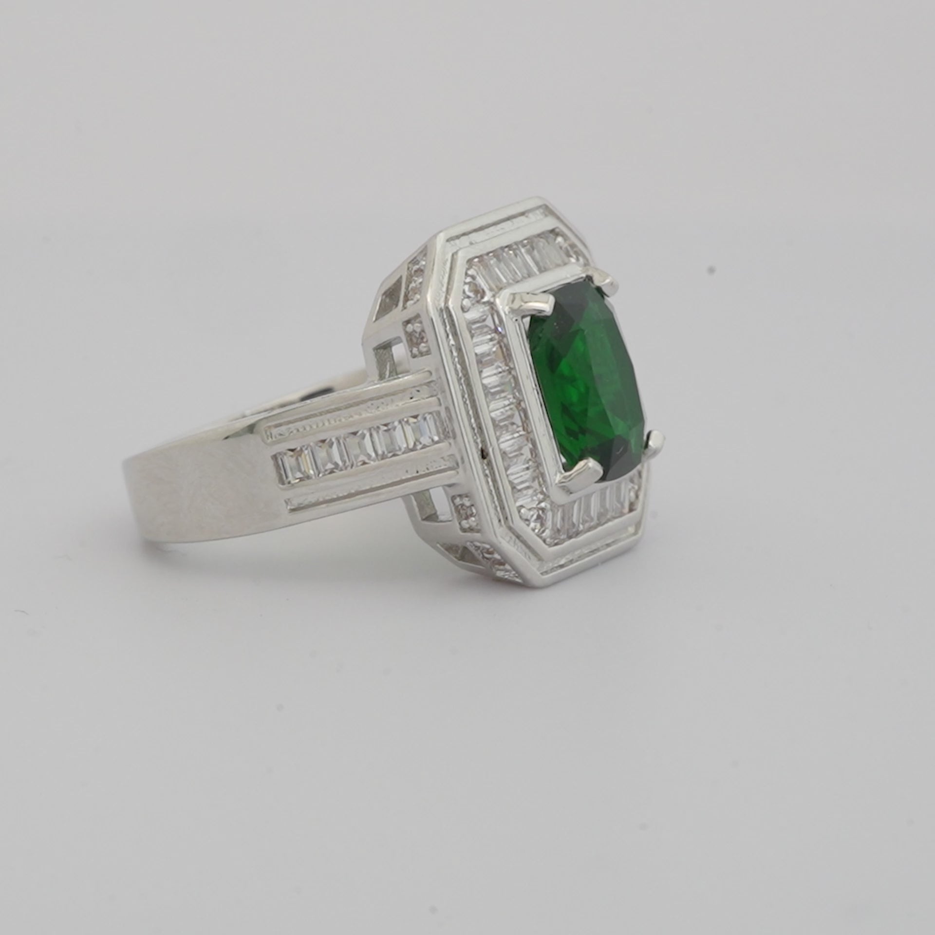 Add timeless sophistication to your collection with this emerald green stone ring in silver finish, designed to make a bold yet elegant statement. The ring features a rectangular emerald-cut green stone at the center, surrounded by dazzling diamond look baguette stones that enhance its luxurious appeal. The sleek silver finish gives it a modern touch while maintaining a royal charm.