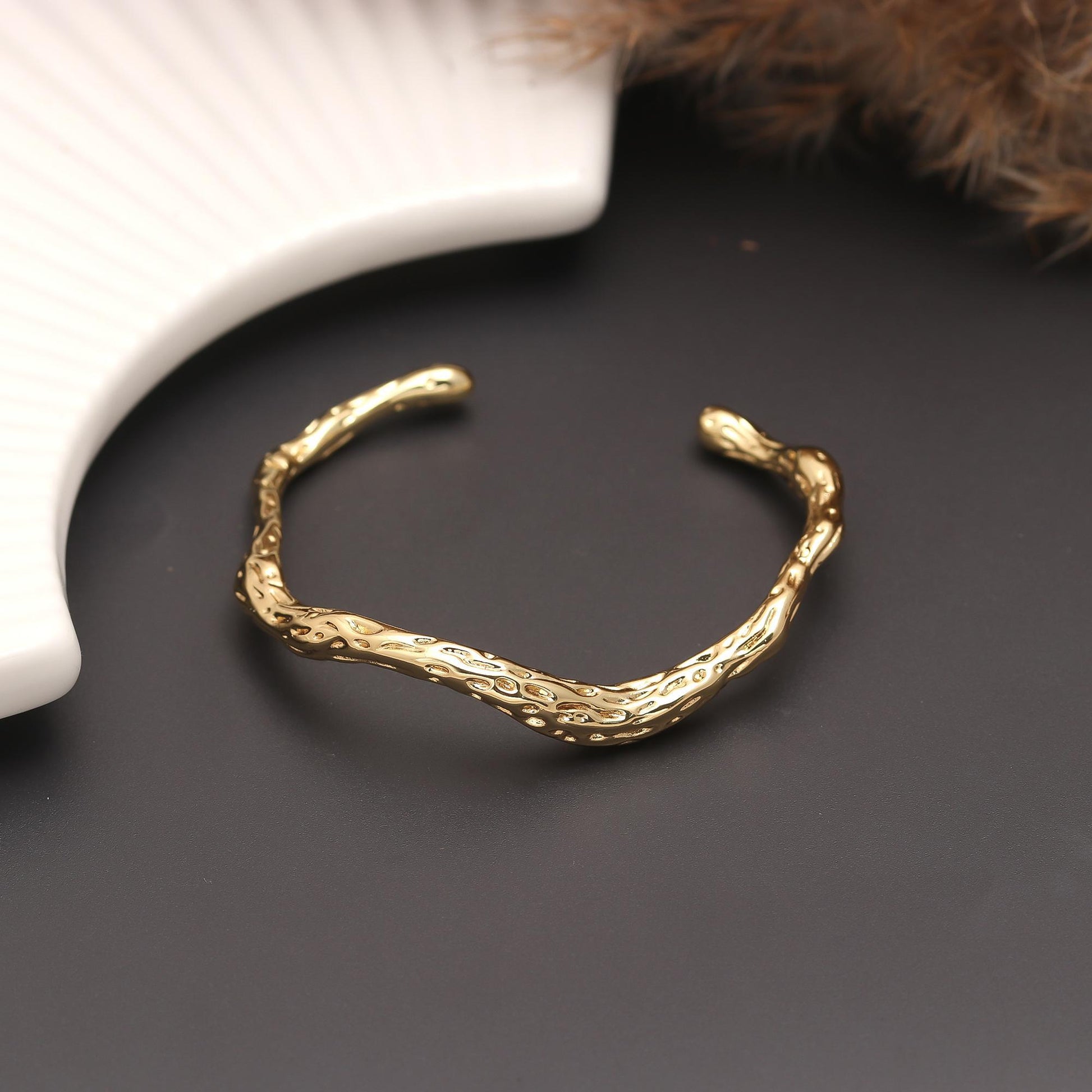 ● Unique wavy gold-tone cuff with lightly textured detailing for modern elegance