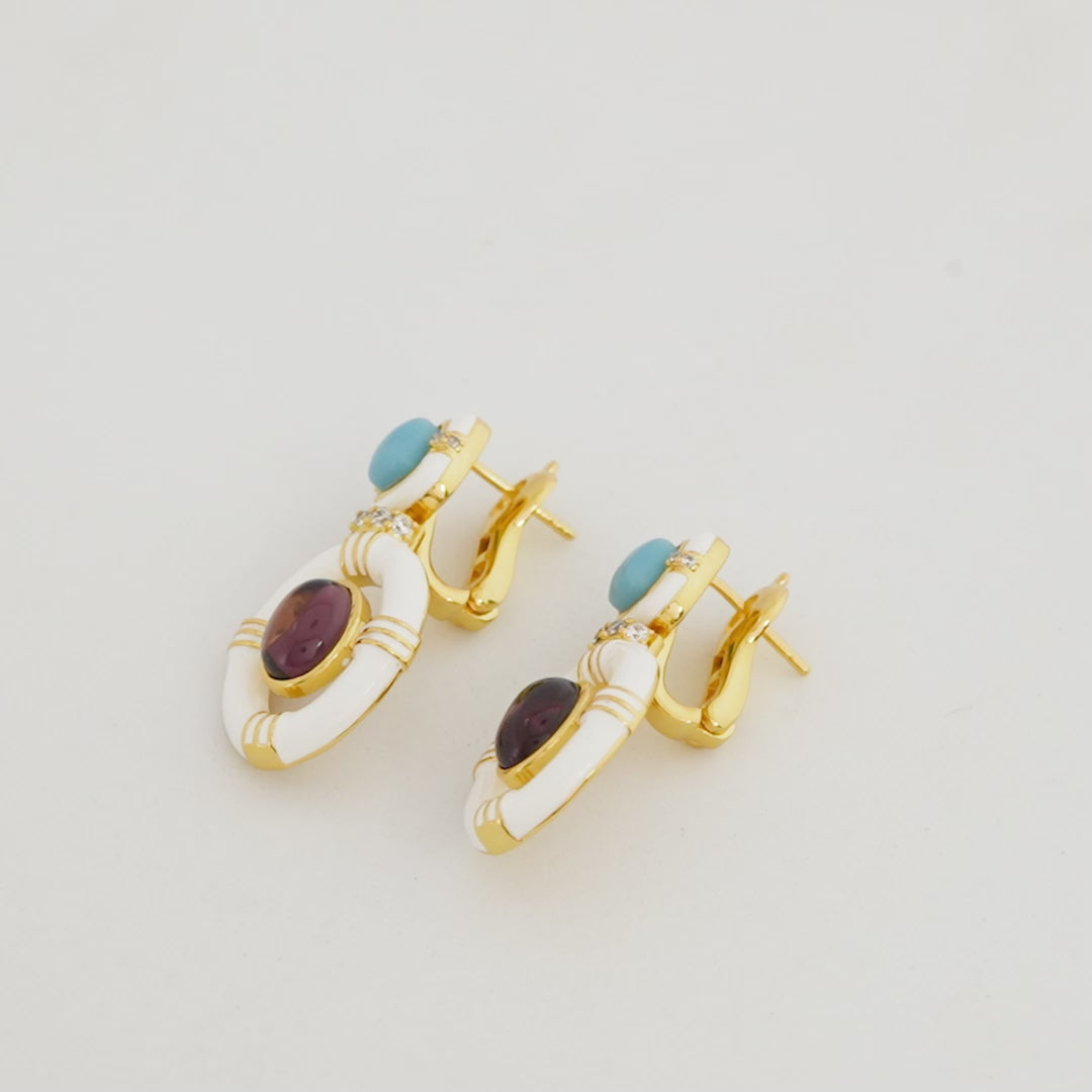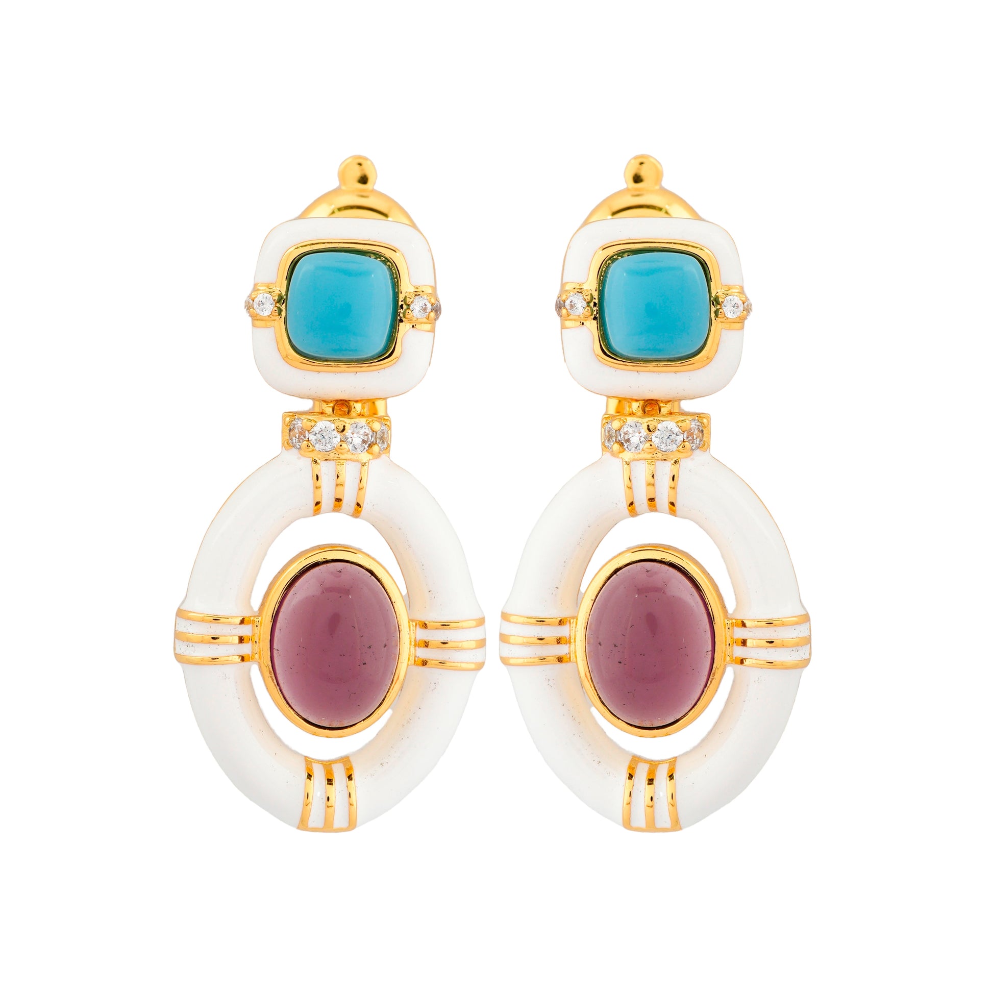 Gold-Plated Dual Gemstone Drop Earrings with Turquoise and Amethyst Accents in White Enamel Frame | Statement Jewelry for Elegant Occasions